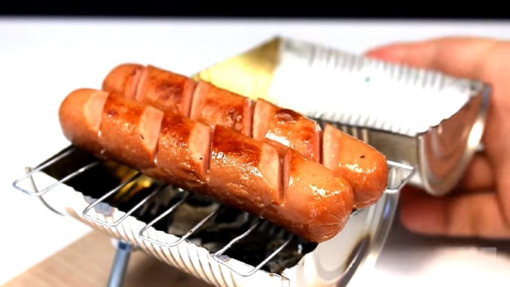 To make this mini griller, you will need two pieces of coal and a soda can. You can use it to grill small pieces of meat and sausages.